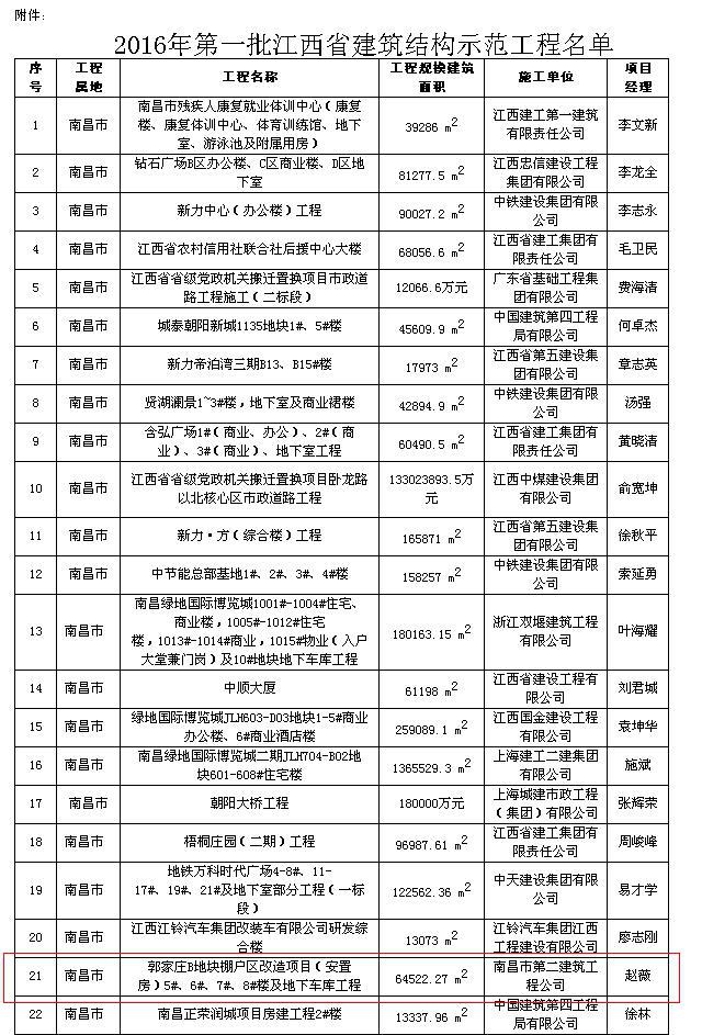 由南昌市第二建筑工程公司承建的郭家莊B地塊棚戶區(qū)改造項目(安置房)5#、6#、7#、8#樓及地下車庫工程獲“2016年第一批江西省建筑結(jié)構(gòu)示范工程” [摘自贛建質(zhì)監(jiān)字[2016]1號]。