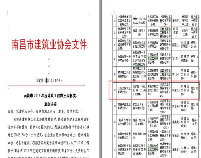 由南昌市第二建筑工程公司承建的江西旺旺新建廠房1#車間工程獲“2015年度江西省優(yōu)良工程獎”,宜春市明月大橋(原宜春大橋)改建及引道工程榮獲“2015年度江西省杜鵑花獎”[摘自江西省住房和城鄉(xiāng)建設(shè)廳文件贛建質(zhì)字[2016]5號]。