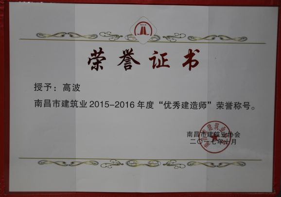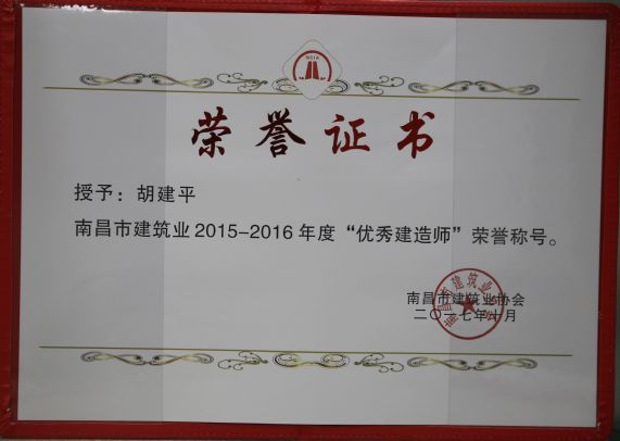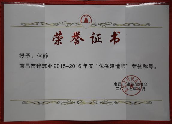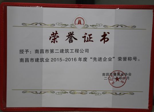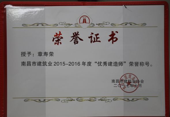 南昌市建筑業(yè)協(xié)會(huì)對(duì)公司頒發(fā)了南昌市建筑業(yè)2015-2016年度“先進(jìn)企業(yè)”榮譽(yù)稱(chēng)號(hào),對(duì)公司建造師章壽榮、何靜、胡建平、高波頒發(fā)了南昌市建筑業(yè)2015-2016年度“優(yōu)秀建造師”榮譽(yù)稱(chēng)號(hào);中國(guó)建筑業(yè)協(xié)會(huì)對(duì)章壽榮頒發(fā)了全國(guó)建筑業(yè)企業(yè)優(yōu)秀項(xiàng)目經(jīng)理榮譽(yù)稱(chēng)號(hào)。