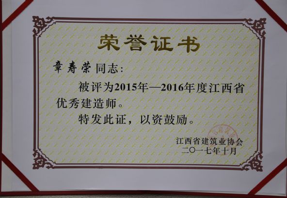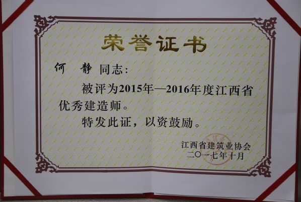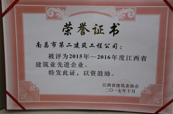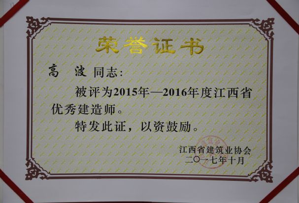 江西省建筑業(yè)協(xié)會對公司頒發(fā)了2015-2016年度江西省建筑業(yè)先進(jìn)企業(yè)榮譽稱號,對公司建造師何靜、胡建平、高波、章壽榮頒發(fā)了2015-2016年度江西省優(yōu)秀建造師榮譽稱號。