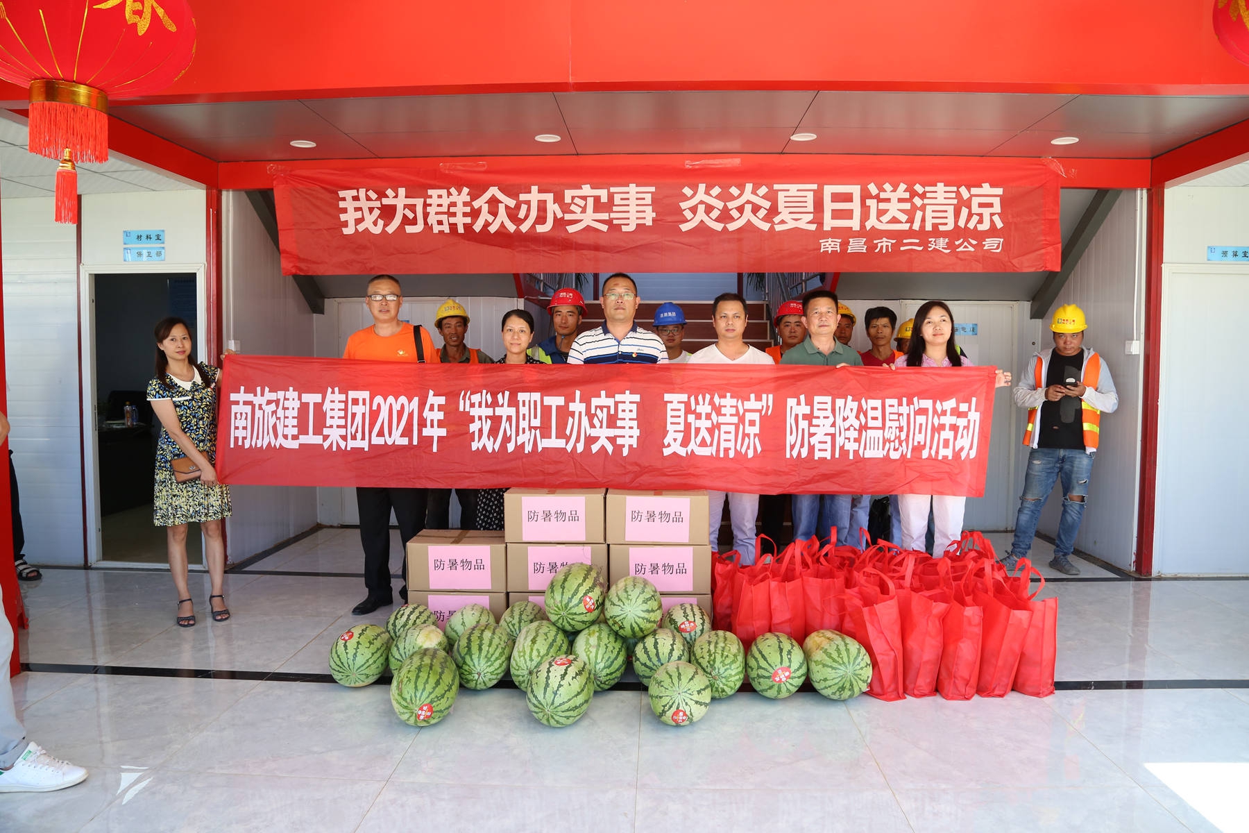 烈日炎炎,持續(xù)高溫。為了給奮戰(zhàn)在工程一線的廣大員工帶去企業(yè)的關懷,7月22日,公司相關部門在南旅建工集團總經理、公司黨委書記、董事長王彥,南旅建工集團黨委副書記、常務副總經理龔戩,公司紀檢書記王小華、工會主席付蓉等領導率領下,先后來到“繩金塔民俗風情街”工程項目部、“滕王閣南擴”項目部及“南昌市第六糧庫易址重建”工程項目部,開展“我為群眾辦實事 炎炎夏日送清涼”活動。每至一處,送上大批西瓜、綠豆、冰糖等防暑物品及藥品,并詢問項目部防暑降溫工作落實情況,督促項目部把工程建設與職工健康安全同時抓牢實,確保項目建設正常推進。