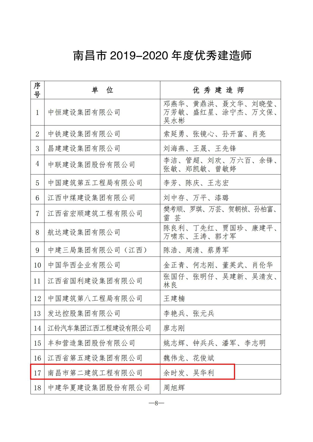為表彰先進(jìn)、樹立典型,鼓勵建筑業(yè)做大做強(qiáng),著力推動我市建筑業(yè)快速健康發(fā)展,南昌市建筑業(yè)協(xié)會開展全市 2019—2020 年度南昌市建筑業(yè)先進(jìn)企業(yè)和優(yōu)秀建造師(監(jiān)理師)評選活動。經(jīng)企業(yè)申報、市建協(xié)評審、綜合市建設(shè)局相關(guān)職能部門意見,共有 82 個單位被評為南昌市建筑業(yè)先進(jìn)企業(yè) ,151 名建造師被評為南昌市建筑業(yè)優(yōu)秀建造師,其中,我公司再次獲評市“先進(jìn)企業(yè)”、余時發(fā)和吳華利被評為市“優(yōu)秀建造師”稱號,并受到表彰。
